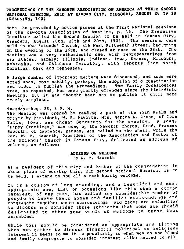 This duty may perhaps become formal, and at times performed in a perfunctory way; but I wish to assure you that on this occasion the speaker feels very contrary wise and should be most delighted to take you individually by the hand and looking straight into your face say welcome thrice, welcome to our fair city and to the Second National Reunion of the Haworth Family of America.